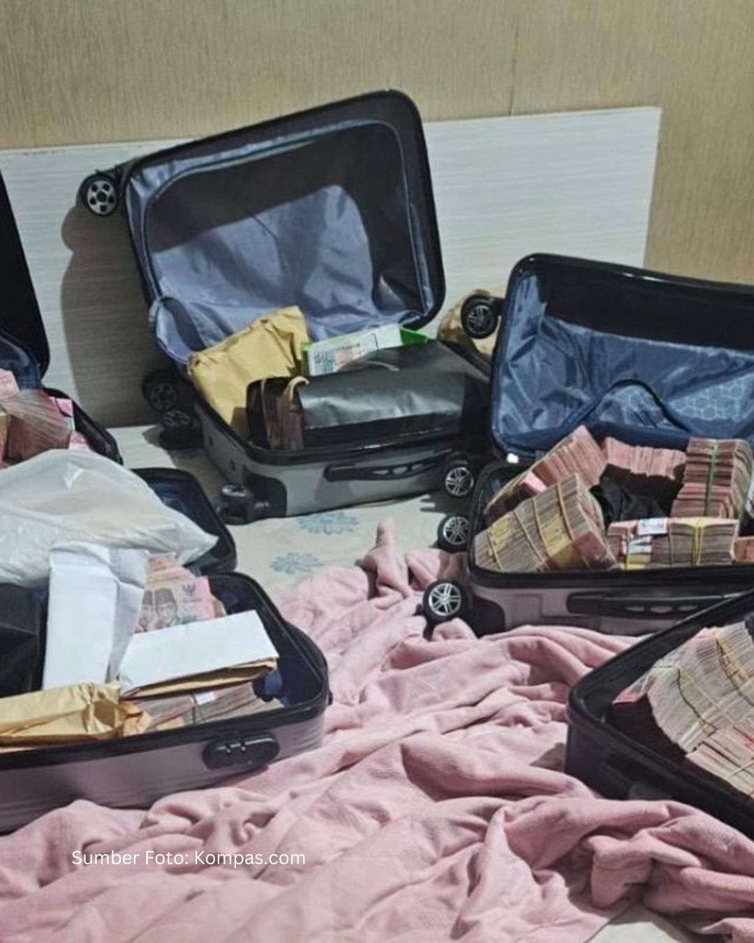KPK memamerkan uang tunai Rp5,19 miliar (termasuk mata uang asing) yang disita dari 5 koper di dua safe house pejabat DJBC Kemenkeu, Jakarta Pusat & Ciputat Tangerang Selatan. Uang diduga gratifikasi dari pengusaha importir & cukai untuk atur jalur masuk barang impor ilegal sejak November 2024. Kep Seksi P2 DJBC Budiman Bayu Prasojo jadi tersangka utama, perintahkan Salisa Asmoaji "bersihkan" safe house awal Februari 2026.