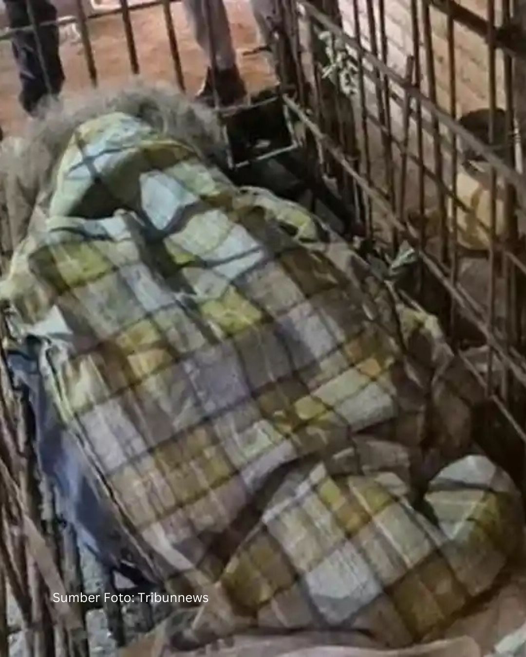 Kandang besi berukuran sempit—lebar 0,5 meter, tinggi 1 meter, panjang 2 meter—ditempatkan di ruang belakang rumah adiknya, sehingga Mbah Kirno tidak pernah menyentuh tanah dan hanya duduk atau selonjor. Keluarga memberi makan tiga kali sehari melalui jeruji, tapi tidak pernah melepaskannya demi alasan keamanan.