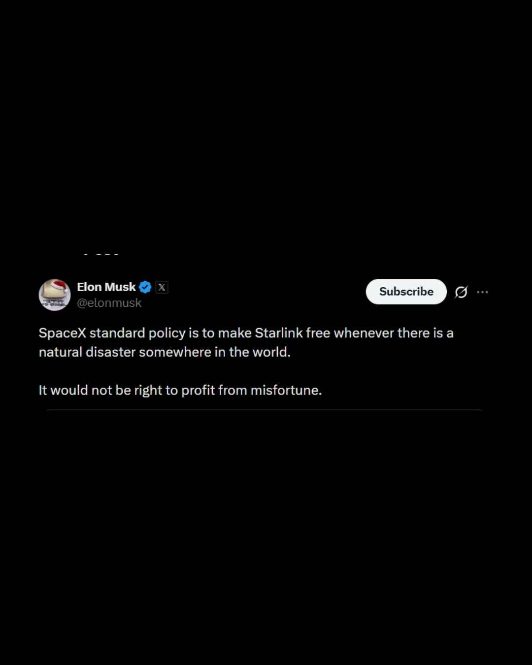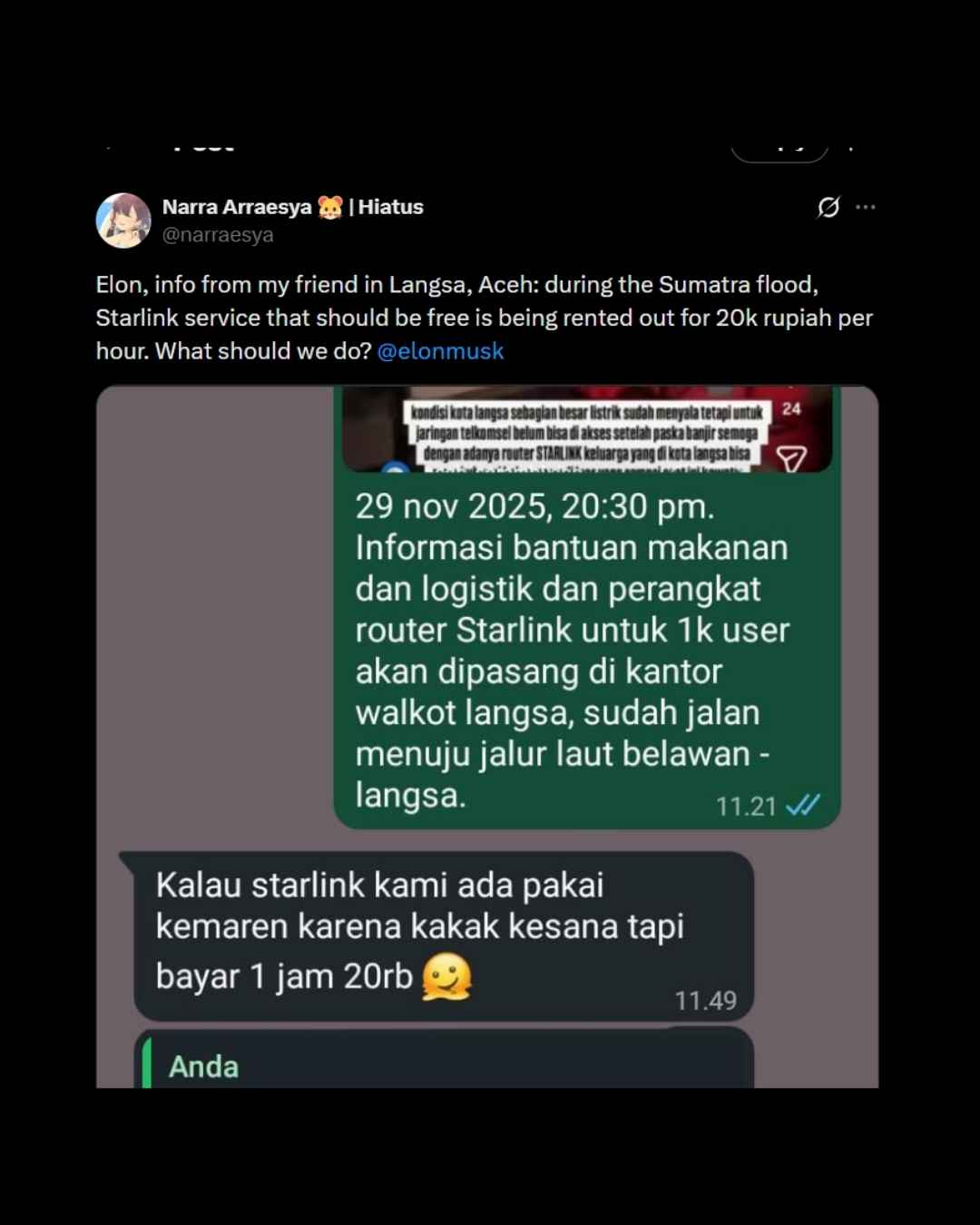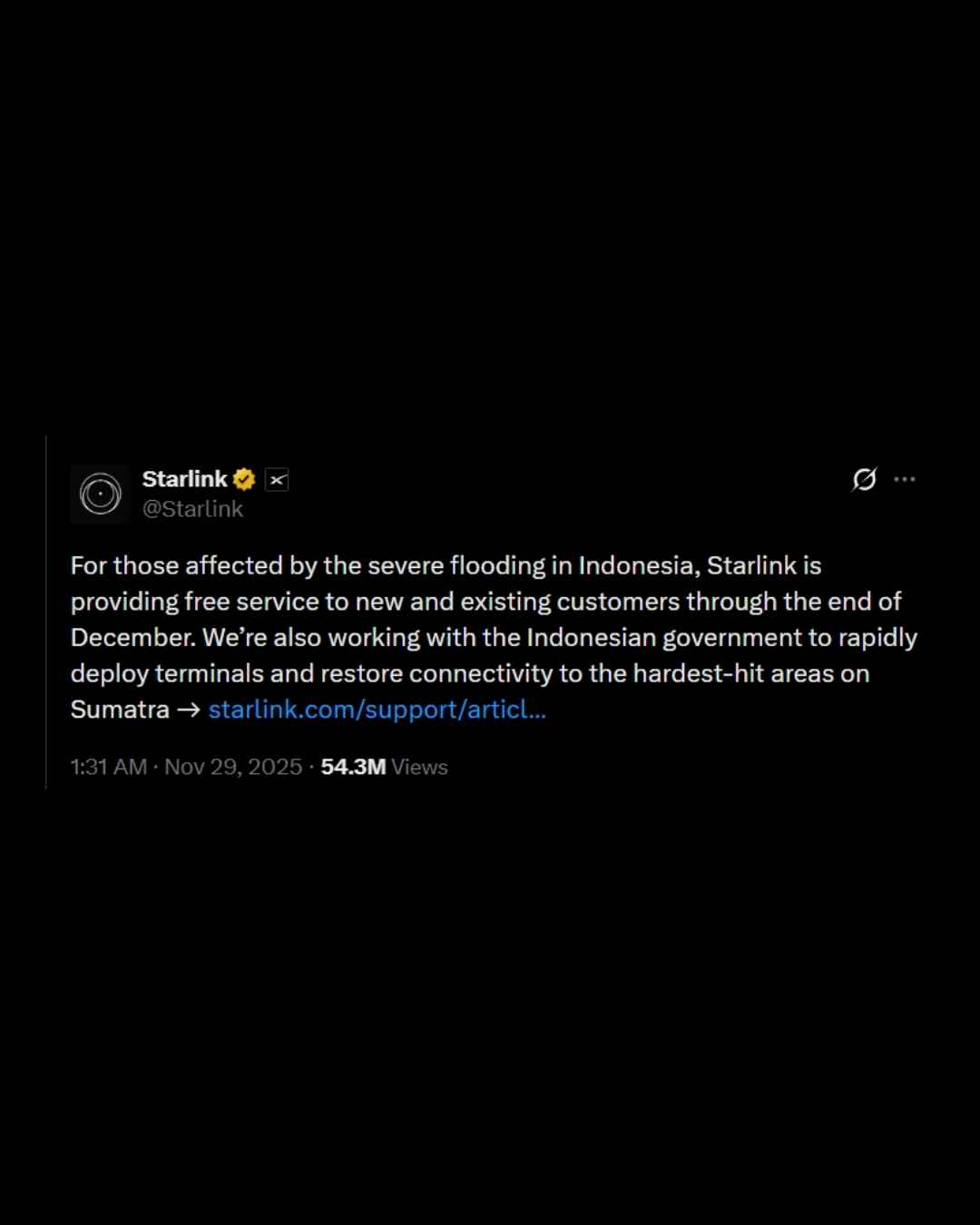 Namun, dalam pernyataannya pada 29 November 2025, Musk menegaskan bahwa kebijakan standar SpaceX adalah menggratiskan akses Starlink setiap kali terjadi bencana alam di suatu negara.